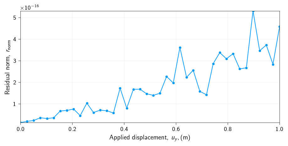 Let us check if the error at each step is below the tolerance level (\(10^{-8}\)) that we specified. We chose to represent the error in the simulation as the norm of the residual.