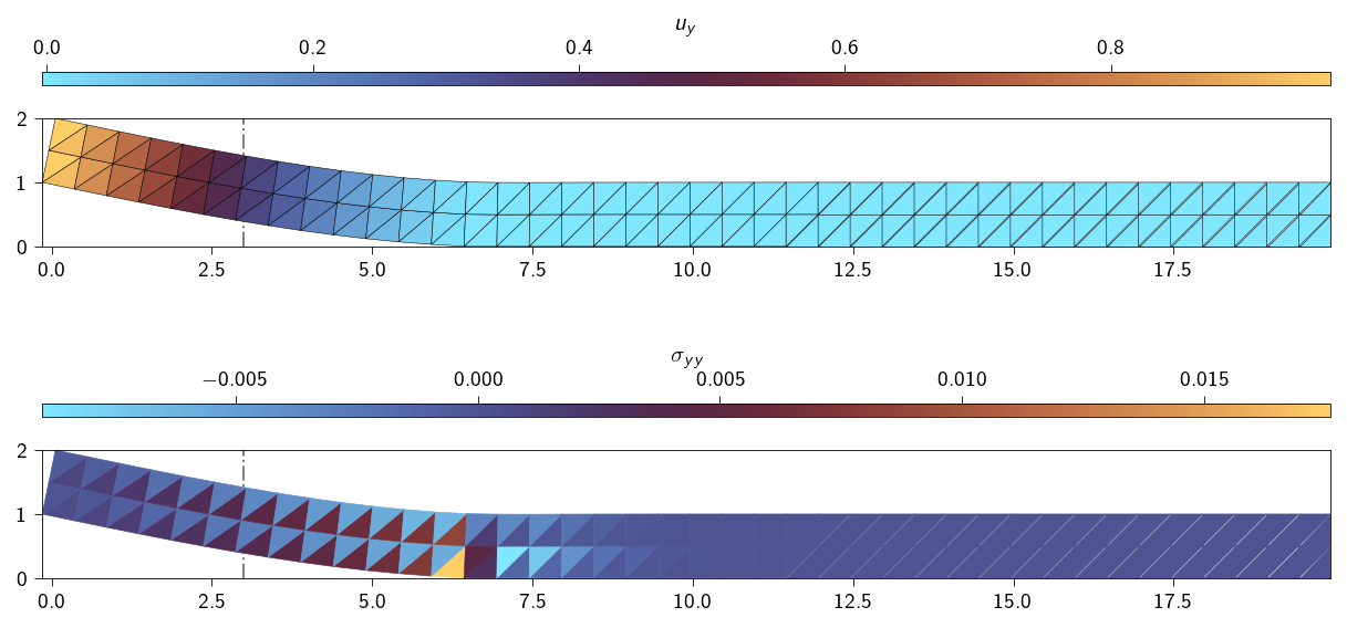 To learn this powerful technique, we will simulate a simple problem: an elastic thin film (length 20 \(m\), height 1 \(m\)) is partially “glued” to a rigid surface. We will then pull it off, and iteratively determine which parts of the glue fail.