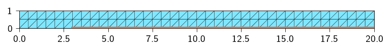 Nx =40# Number of elements in XNy =2# Number of elements in YLx =20# Length in XLy =1# Length in Yadhesive_start =3.# x position of the start of the adhesive region# function identifies nodes on the cohesive line at y = 0. and x > 3.0def interface_line(coord: Array, tol: float) ->bool:return jnp.logical_and(jnp.isclose(coord[1], 0.0, atol=tol), coord[0] >= adhesive_start)( mesh, interface_elements,) = generate_block_mesh( nx=Nx, ny=Ny, lxs=(0, Lx), lys=(0, Ly), curve_func=interface_line)n_nodes = mesh.coords.shape[0]n_dofs_per_node =2n_dofs = n_dofs_per_node * n_nodes
