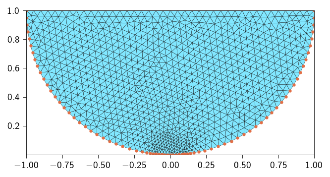 Below, we generate a triangular mesh of a half-circle. We also define a function to get the elements and nodes on the potential contact surface.
