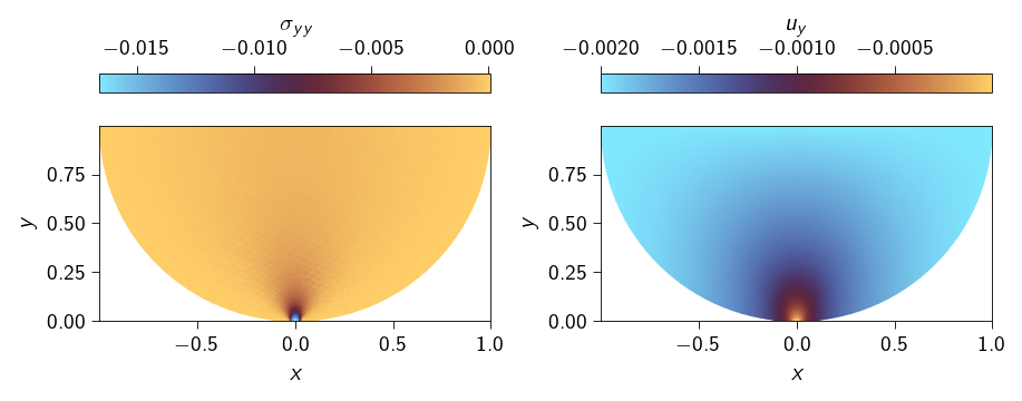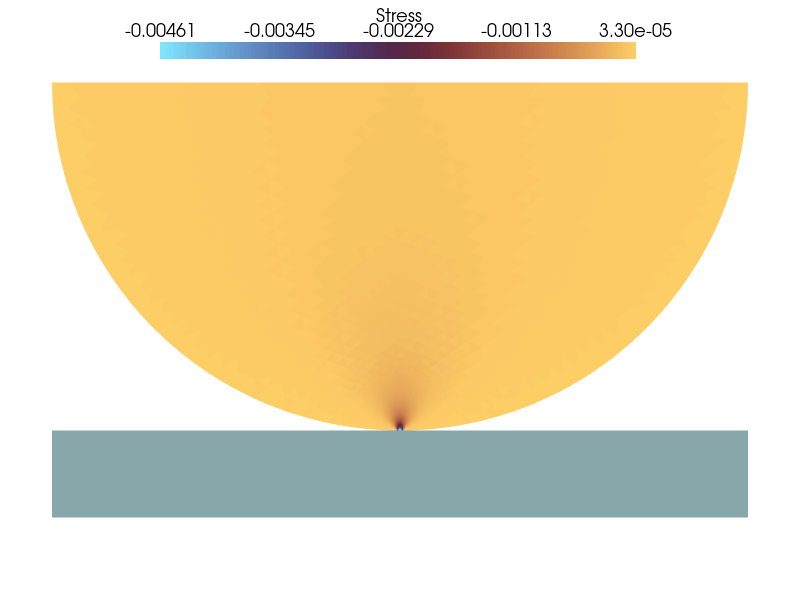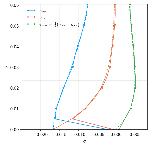 Next, we will compute the stresses along the line \(x=0\) from our numerical solution and compare them with the stresses from Hertz theory.