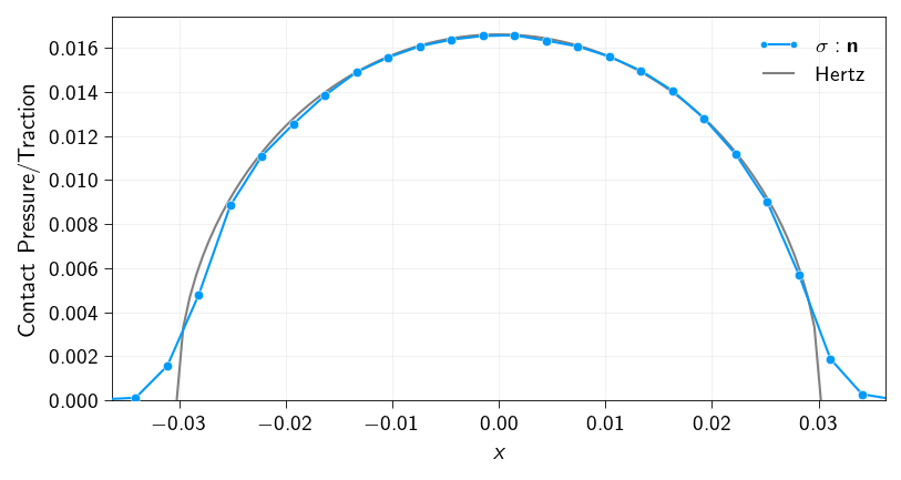 Figure 11.4: Profile of traction normal (\(t_n = \boldsymbol{\sigma} : \boldsymbol{n}\)) to the curved surface computed from the numerical solution (blue) and compare it with Hertz theory (gray).