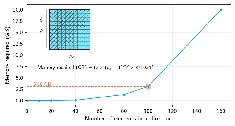 For a mesh with 100 \(\times\) 100 triangular elements (roughly 10000 nodes) with each node having 2 degrees of freedom, the size of a stiffness matrix will be a 20000 \(\times\) 20000 matrix. This means we need to store 400 million entries. And since we need to store each entry in double precision (float64, for accuracy), we need 3.1 GB of memory to store the dense stiffness matrix.