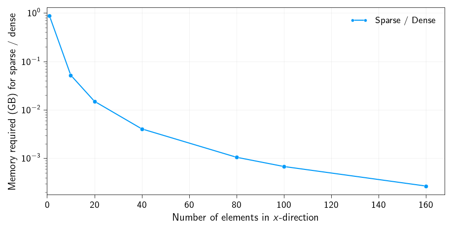 As a quick analyses let us check how much memory is saved by using a sparse representation of the stiffness matrix. Below we plot the ratio of the memory required for the sparse stiffness matrix to the memory required for the dense stiffness matrix.